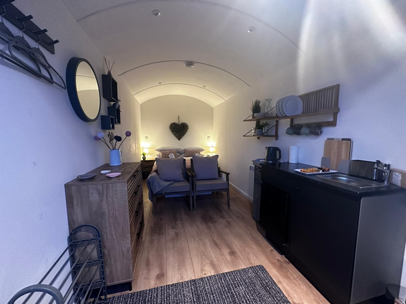 She sleeps X2 in a double bed with a stove and sink. Our furry friends are welcome, but just one small dog is permitted due to the space available.